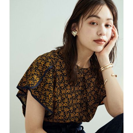 花柄&無地スタンドネックパイピングスリーブブラウス