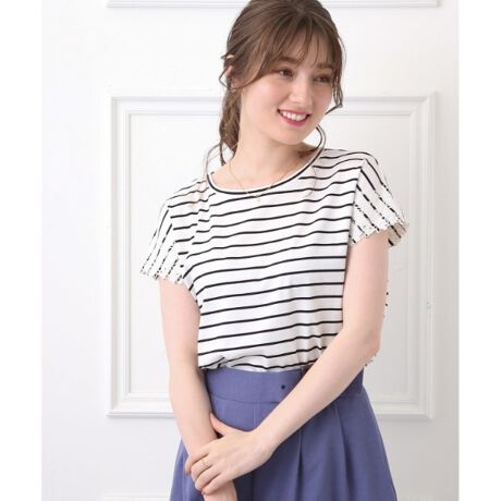二の腕が隠れる丈感のフレンチスリーブで、袖の小花柄刺繍がフェミニンな一枚です。