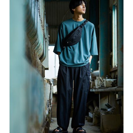 裾にスピンドルがついているので、裾を絞ることでワイドジョガーパンツのようなシルエットでも着用できます。