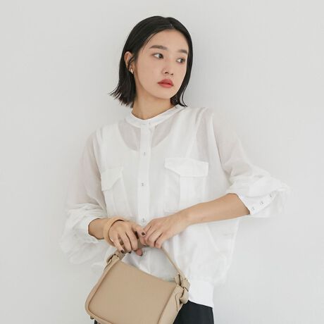 シャツのような軽い素材のブルゾン。今年はさらに注目を浴びているミニタリーテイストに仕上げました。胸元の大き目のポケットと裾のリブはメンズライクな仕上がりですが、カフスと首元がどこか女性らしさを演出。少し透け感のある素材は、今から着られる1着。羽織としてはもちろん、ブラウスのように前をしめてプルオーバーとして着ても◎