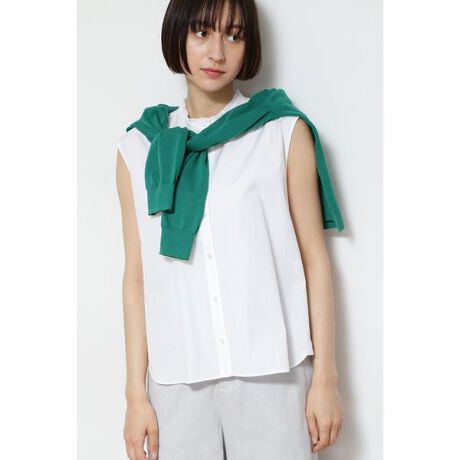 フリル衿が上品見えのノースリーブのスタンドカラーブラウスデザイン 【デザインポイント】 衿先にチビフリルをあしらったシンプルなスタンドカラーのノースリブブラウス。定番の白と濃色のブラウンの2色展開です。 【素材のポイント】 細番手の糸で織り上げた高密度なブロードはきれい目な表面感が特徴です。 【おすすめコーディネート】 夏の1枚着としても、少し涼しくなってきたら羽織のインとしても長く使っていただけるように仕上げてあります。スカートにもパンツにもコーディネートしやすいデザインです。※この商品は、素材の特性上激しい運動や極度な力が加わると、縫い目が開いたり目寄れ(織り糸が滑り、縫目が開く)する性質を持っています。ご着用の際はご注意ください。