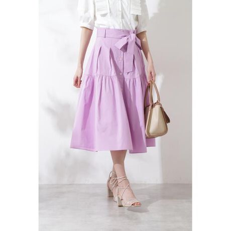夏にぴったりのキレイなカラーが印象的なハイウエストスカートコットン素材を使用、裏地もついているのでさらりと着用いただけます。フロントボタンやティアード切り替えが、フェミニンなポイントになります。ハイウエストのデザインは後ろを一部ゴムにし、ラクながら伸縮性もプラスされた着心地です。着丈は長すぎず、シーズンスタイルに相性抜群の1着です。共布リボンベルトは取り外し可能で、気分やトップスに合わせて雰囲気をかえて楽しめます。
