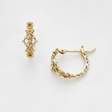 連なる小さな星々と、その周囲に線のような輝きとして現れる光条をモチーフにしたピアス。星は球体なのに、十字型や五芒星の形で表現されるのは、遠くに光る小さな点のような輝きを写し撮るときに光条が見られるためとされています。前面は透かし模様でボリュームを持たせ、背面はチャームを通しやすいよう細身に仕上げています。タイニーチャームシリーズとのコーディネートがおすすめです。※天然石・天然素材を使用しているものや、職人が1点1点加工しているものは、サイズ・色味・風合いの違いや、若干の傷、内包物の有無などに個体差があります。予めご了承ください。