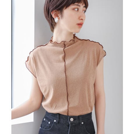 インナーとして1枚は持っておきたいフレンチスリーブのシアートップス。程よく透けるシアー素材で配色のメロウ始末がワンポイントになったアイテムです◎