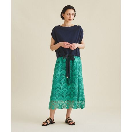 ワンピースとカットソーがセットになった、様々な着回しを楽しめる一枚。ワンピースは、トルコ“BROCHE”(ブロチェ)社の大胆な美しいキカレースを使用した、贅沢仕様のデザイン。トップスは上質な天竺カットソーを使用して、裾にリボンを通したラフなシルエット。その二つを重ねて着る事で、バランスの良いレイヤードスタイルを手軽に楽しめる魅力的なアイテムです。締め付けのない楽な着心地で、気取らないデイリースタイルにぴったりな一品です。