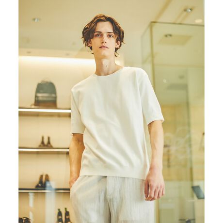 通常のカットソー天竺と異なり、ニットならではのハイゲージの目の細かさが一枚で着た際にサマになります。また、50/2の糸を使用しているため、素肌の透けは殆ど気になりません。ニットソーならではの裾と袖口は編み続きのリブ仕様を採用し、カジュアルと上品さのバランスを保つような程よいネックの開きもポイントです。