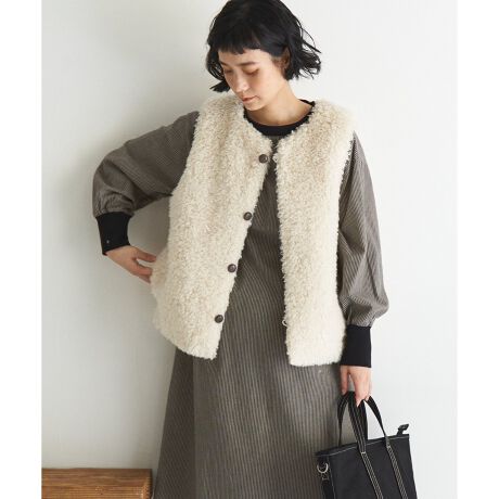 トレンドのボアベストを LBC らしく着こなせるよう、クルミ調のボタンや、やや粒感のあるボアを使用しています。
