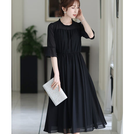 首元と袖のフリルがポイントになりシンプルな中にデザイン性のあるワンピースです。