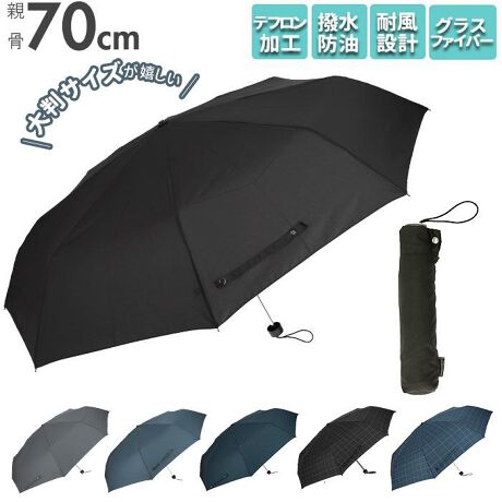 大判サイズが嬉しい親骨70cmの紳士用、折りたたみ傘が新登場。親骨の一部にしなやかで折れにくく錆びにくいグラスファイバー骨を使用。開閉時は指先や爪を挟むのを防止する、安全ろくろ付きの手開き仕様で使い勝手が良い。傘生地をまとめるバンドはスナップボタンタイプ。ハンドルはロゴ入りの持ちやすいプラスチック製。傘生地にはテフロン加工が施されてたポンジ生地を採用。撥水・撥油機能に優れているのがポイント。