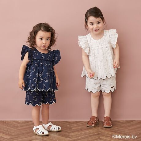 ミッフィーのお顔をシンプルなタッチで描いたショートパンツです。グラフィックに色塗りなどはせず、本体の生地から浮かび上がるような個性あふれる雰囲気に仕上げました。裾スカラップのシルエットによって可愛らしさを上乗せ。ウエストにリボン飾りを添えており、トップスをインしたスタイリングもおすすめです。両側にポケットつき。同パターンのブラウス(品番:9622215)とセットアップも楽しめます。【おすすめの着用時期は春夏シーズン】【透け感】透けない【生地の厚さ】普通【伸縮性】なし【裏地】なし【ポケット】あり【アジャスター】なし