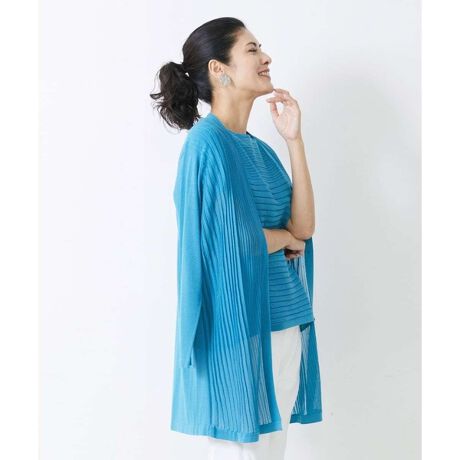 シアーストライプカーディガン。前身頃ストライプは天竺+袋のボーダーを横使いしています。同色スパーク糸を交編し、シアー+ブライト感のある編地に仕上げています。後身頃と袖は天竺にしています。同素材のニットとセットで着用いただけます。