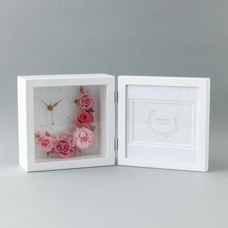 お部屋を華やかに彩るインテリア♪プリザーブドフラワーを品よくまとめた、時計付きフォトフレームが発売。