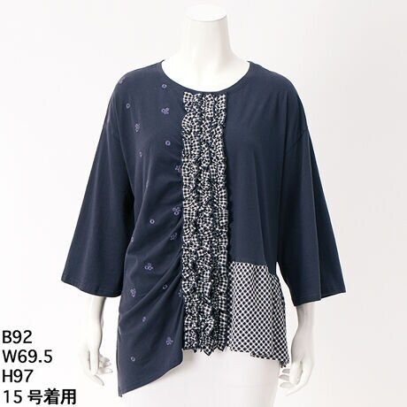 定番の30/-天竺に凹凸の素材感が特徴のギンガムチェックの生地をミックスし、大胆にあしらったフリルが印象的なTシャツ。前右身頃にリング状のドットの刺繍を施し、アシンメトリーな丈で動きのあるデザインにしています。コーデの主役になる存在感のある1枚になっています。