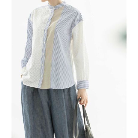 タイプライターとエンブロイダリーレースとリネン生地でのmiscシャツ。ヨーロッパの「農夫」のようなやさしく素朴なイメージのスタンドカラーシャツをイメージしたデザインです。シェルボタン使用。前を開けた時にちらりと見える配色ステッチが効いています。