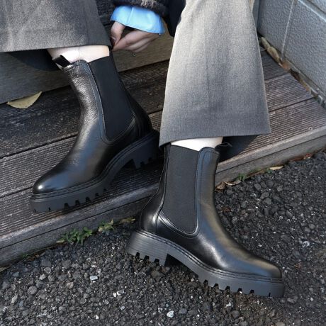 サイドゴアで脱ぎ履きも楽にできて、シャープなシルエットなのですっきりした印象に。丈感は短すぎず長すぎずバランスの取りやすい長さでどんなコーディネートとも合わせやすい!私はデニムなどカジュアルなアイテムと合わせて履きたいです。================================================