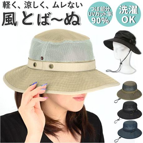風に飛ばされにくい「milsa M風とばーぬ アドベンチャー」が新登場。つば部分はUVカット率90%以上!顔周りを日射しと紫外線からしっかりと守ってくれる。両端をスナップボタンで留めて、ツバの形をアレンジすることも可能。サッと取り出せる面ファスナータイプのベルトは吸湿速乾素材機能付き。汗や汚れが気になったらすぐ外せて洗える◎洗濯ネットに入れれば洗濯機で洗えお手入れ楽チン◎さらにメッシュ生地で作られており通気性もあり蒸れにくく涼しい♪内側の面ファスナータイプのベルトを引っ張ってフィット感の調節が可能。あご紐が付いており風の強い日や自転車に乗っていても飛ばされにくい。クルクル丸めればコンパクトに、カバンの中に入れて持ち運びしやすいのも嬉しい。普段のお出かけからアウトドアシーンまで活躍してくれる。