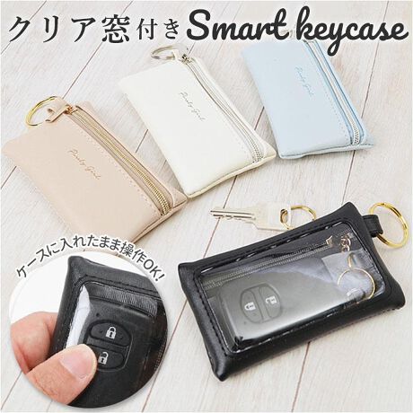スマートキーと鍵を一緒に収納することが出来る「スマートキーケース」が新登場。クリア窓付きで、ケースに入れたままスマートキーの操作が可能。ケース内に仕切りがあり、表側にはチェーン付きのキーリングも付いているから、ご自宅の鍵をまとめて持ち歩くことができて便利。合皮素材を使った、シンプルでおしゃれなスマートキーケース。プレゼントにもおすすめ。
