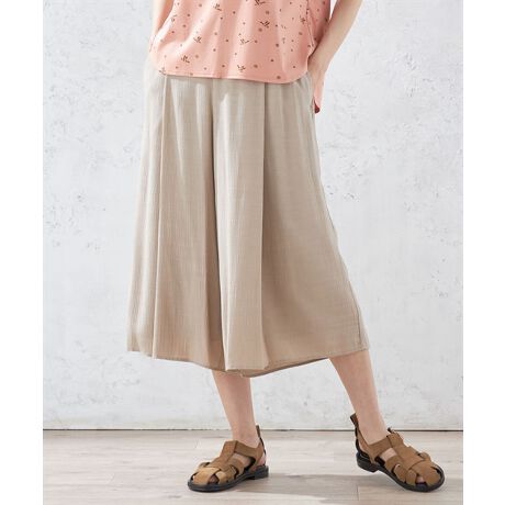 ナチュラルで涼しげな楊柳生地を用いたガウチョパンツ。腰まわりのタックやギャザーが女性らしいドレープを生み出し、歩くたびに裾が優雅に揺らめきます。ウエストはストレスフリーなゴム仕様。サイドには便利なポケット付きです。
