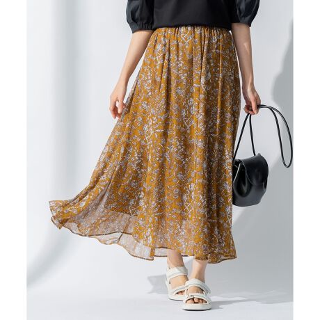 深みのあるシックな印象のフラワープリントのスカート。ボリュームのあるフレアシルエットは女性らしさを引き上げます。Tシャツやシンプルなニットを合わせてコーディネイトの主役として活用したり、同素材のブラウスと合わせセットアップにしても着用していただけます。カラー展開はマスタード(#540)とブルー(#570)の2色です。※ウエストはファスナー開き仕様です。