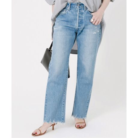 番手は太いのでしっかりデニムの生地表情があります。染色はピュアインディゴで若干淡く染めており、上品なインディゴブルーを表現しています。シルエットはストレートシルエットでメンズライクに形成されたお尻回りはピップに特徴を持ちます。ストレート具合もクラシカルなストレートでありながらモダンに見えるよう成形しています。縫製に使用する糸は古着に使用するような薄いイエローになり経年変化を楽しめる色味になります。