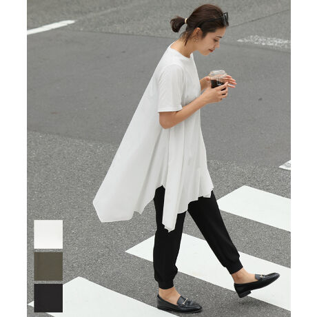 無地Tシャツでも裾のイレギュラーヘムがデザインのアクセントに。