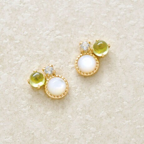 カボションカットによって薄く透き通るペリドット(8月誕生石)と、クラシカルな石枠でツヤ感のあるホワイトシェル、アクセントのスカイブルートパーズ(11月誕生石)で、大人らしい印象を与えてくれます。