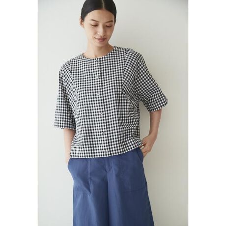 変形カットラインのアームホールがポイント。これからのシーズンに着回しやすい前あきのクルーネックブラウスです。
