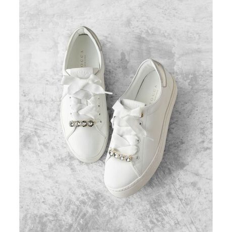 取り外し可能なビジューシューピアスがリュクスに映える、レースアップスニーカー。シューレースにはグログランリボンを使用し、かかとのクッションにはシャンパンゴールドやピンクベージュ、新色にはシルバーをセレクト。ベロ部分にはTOCCAの王冠マークを刻印し、随所にほんのり大人っぽくロマンティックな雰囲気が漂います。軽量の厚底ソールなので、スタイルアップ効果はもちろん歩きやすさもGOOD。シンプルな中にもTOCCAならではのデザインが光るスニーカーです。