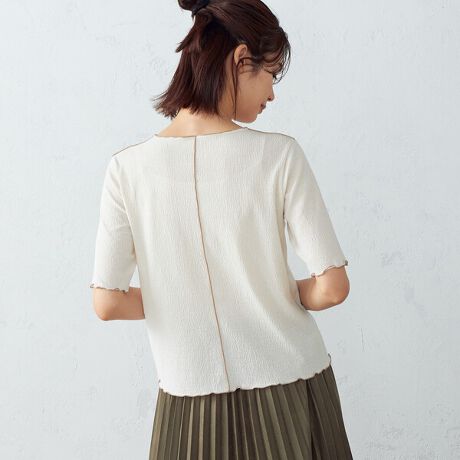 衿口、肩線、袖口、裾、後ろ中心線に入った配色のメロウロックがアクセント。