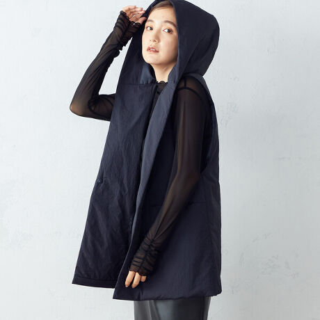 フード付きの、中綿ロングベストです。