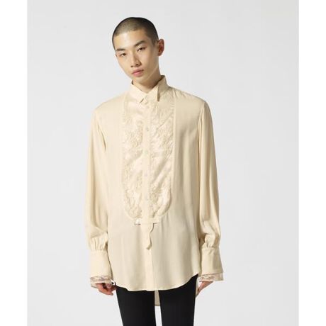 ROYAL FLASH 別注商品SHARE SPIRIT過去の名作のレースコンビのシャツを完全リファインドしたモデル。旧作はレースが一枚で透けてしまっていたが、内側にサテン地を挟み込む事でデザイン性と機能性が向上しています。程よいオーバーサイズにドレープが美しく際立つ。レーヨン地は洗っても干すだけで自重でシワが伸びるので使い勝手◎なアイテムです。SHARE SPIRIT/シェアースピリットシェアースピリット(SHARE SPIRIT)は片野光が立ち上げた日本のファッションブランド 。メンズ及びレディースウェアを展開。細部まで細かく作りこまれたコレクションは、日本国内はもちろん、海外でも強い人気を誇る。デザイナーの片野光が旅を通して感じたもの、見たもの、聞いたもの、文化、民族などからインスパイアされ、シェアースピリットのコレクションに反映させている。アンティーク、ヴィンテージ調のコレクションが特徴。