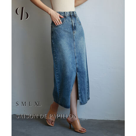 さり気ない肌見せのセンタースリットで縦長なデニムスカートに適度な抜け感を。