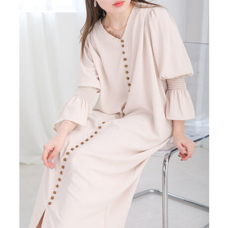 Babらしさがぎゅっと詰まった特別なワンピースです!一番のポイントはボタン使いと袖のシャーリング。くるみボタンをたくさん使うことでデザイン性を高めています。また本体生地と配色になっているのでカラーでアクセントを用いています。お袖はふわっとしたキャンディースリーブになるようにゴムでキュッとしたデザインに。シャーリング部分を長めに取っているので今年らしさも出て◎