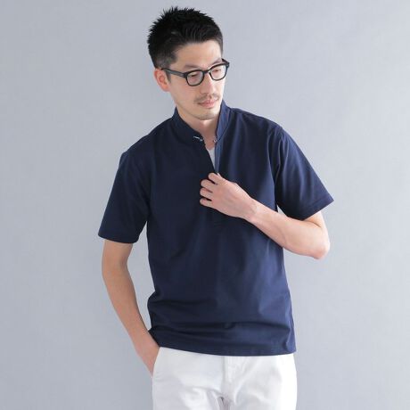 大人の表情に仕上げたショールカラーポロシャツ。\n\n上品なショールカラーのデザイン、さり気ない襟元のワンポイントなど、大人の表情に仕上げたポロシャツです。\n生地には清涼感と通気性に優れた夏の定番素材である鹿の子を使用しております。\n一枚での着用はもちろん、ジャケットのインナーとしても合わせやすいスッキリとしたシルエット。\nカジュアルからビジネスと幅広いシーンでの活躍が期待できるアイテムです。\n\n※画像の商品はサンプルです。\n実際の商品と仕様、加工、サイズが若干異なる場合がございます。