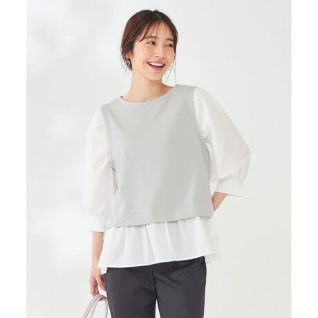 異素材をドッキングさせたプルオーバーです。前身頃は短めの丈にすることで、自然と腰の位置を高く見せてくれます。また後身頃の裾は長めにすることで、気になるヒップラインをカバー。裾に向かって広がるシルエットなので、細みのパンツと相性抜群です。袖は程よいボリュームがあり、トレンド感を余す事なく詰め込んだトップスに仕上がっています。