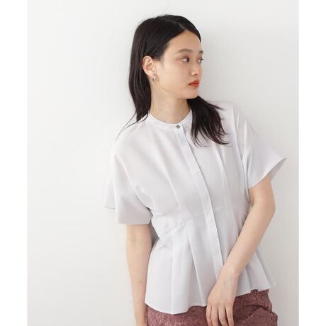 顔まわりをすっきり仕立てたバンドカラーブラウス。ドライタッチな肌触りと軽やかな着心地でこれからの季節にぴったりな風合いです。ウエストのタックで腰位置を高く見せ、お腹まわりをカバーする着心地の良いシルエット。タイトスカートにもパンツスタイルにも着まわしできる一枚です。