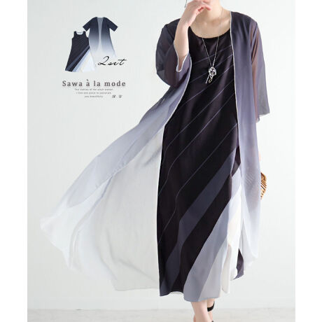 ひらり風に舞うグラデーションのアンサンブルワンピース。美しいグラデーションカラーが目を引く上品なアンサンブルです。セットでも単品でも着れるので気分に合わせて着まわしが楽しめます。綺麗なAラインシルエットが女性らしい印象にしてくれます。着るだけで全身をエレガントな雰囲気に包み込んでくれるデザインです。