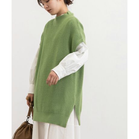 ワッフル編みハイネックロングベスト