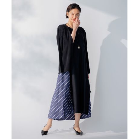 ■デザイン前身ごろがジャージー素材、後ろ見頃が布帛のシャツ地コンビワンピース。大胆にゆとりを出し、今から真夏の暑い時期1枚でさらっと着用できます。後ろ見頃のシャツ地はバイアスにとり、後ろから見ても印象的な1枚です。
