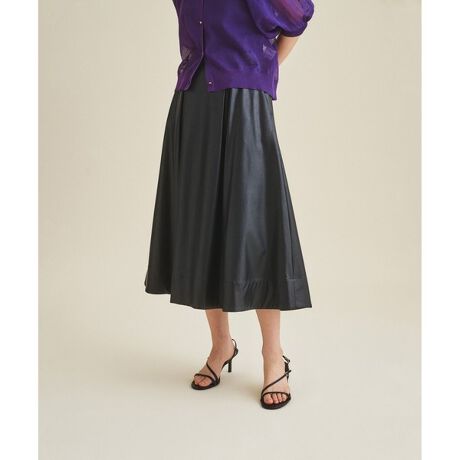 柔らかなフェイクレザーで仕上げた、秋にぴったりなスカート。ウエスト周りはすっきりと、そこから裾にかけて広がる様にボックスタックを入れた、綺麗に裾が波打つような拘りのシルエット。女性らしくエレガントな着こなしを楽しめる着丈も魅力です。パンプスでフェミニンに纏めたり、ブーツを合わせてシーズンらしく着こなすのもおすすめです。