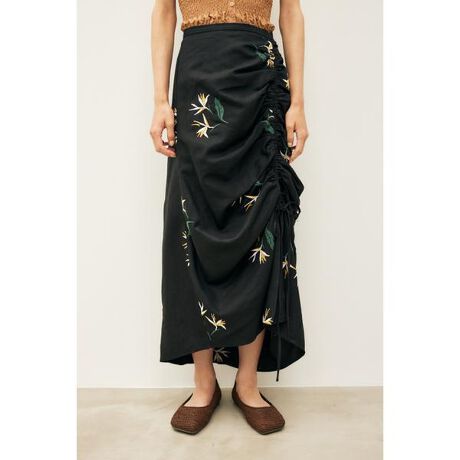 M_(エムアンダーバー)【M_GATHER DETAIL SKIRT】多色使いの刺繍が目を引くスカート。極楽鳥花をモチーフにしたオリジナルの柄です。左前の紐を絞り、ギャザーを寄せることで、アシンメトリーで動きのあるシルエットに。素材にオーガニックコットンを使用し、麻と混紡した涼感のある生地です。Tシャツ合わせのラフなコーディネイトはもちろん、同素材のブラウスと合わせたセットアップもおすすめです。