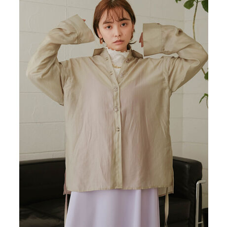 トレンドの気分にあわせてアレンジができるシアーシャツ!袖はボタンで取り外しできるので、肌見みせしたり、フレンチスリーブシャツとしても着用いただけます。またサイドにはスリットと紐が付いているので紐を絞ることで印象を変化させることができます。もちろんそのまま紐を垂らしたままでも素敵です。