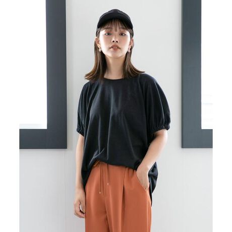 リラックスして着られるカットソー生地のトップス。ギャザーを寄せた女性らしい袖は袖口をゴム仕様にしてメリハリをON。トップスをアウトにして着てもサマになるラウンドの裾は柔らかな雰囲気のコーディネートに導きます。シンプルで着回しの効くトップスはワードローブに1枚備えておくと重宝◎。