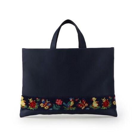愛らしい生き物たちをデザインした「ハイジ」柄のバッグです。学校で使い易いネイビーカラーにこだわり、「お母さんとお子さんが使える物」をテーマに作り上げました。本体のナイロン生地は裏張りがされており、しっかりとした質感になっています。内側にはにじみ止め加工が施された、お名前テープを付けました。お子様のお稽古バッグとして、大人のデイリーバッグにと幅広く活躍するアイテムです。
