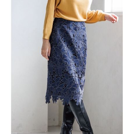 刺繍のカラーを変えて2配色で立体感と柄を引き立たせたレースタイトスカート