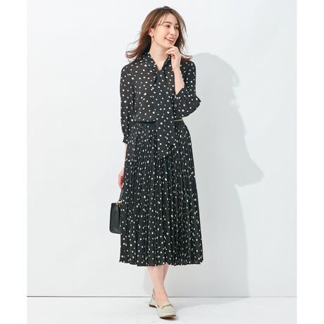 ■素材軽やかなポリエステルシフォンに手描き調のランダムドットをプリントしました。しなやかな落ち感と程よい透け感が女性らしい素材感です。