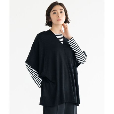 ■デザインニットポンチョとボートネックのカットソーがセットになったマルチWAYコンビ。ニットは天竺で軽やかに編みたてたトレンドのニットポンチョです。カットソーは度目を詰めて編みたてた、肌離れの良いさらりとしたドライタッチが特徴の長袖プルオーバーです。セット着用はもちろん、どちらも単品使いができるので着こなしの幅が広がります。トレンドとベーシックがひとつになったアイテムです。