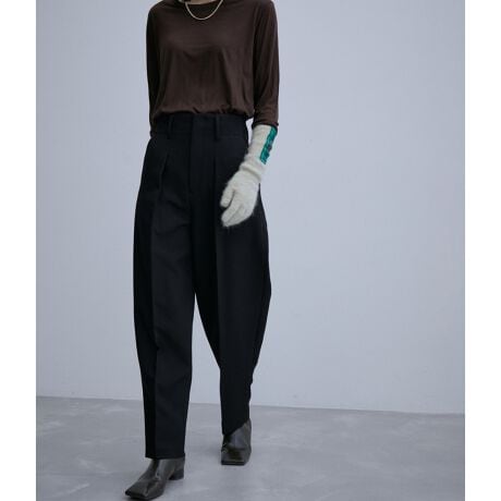 まるでバナナのようなコクーンシルエットのフォルムに、どこかモード感の漂うパンツ。ややハイウエストめで脚長効果があり、ウエストはしっかりと絞りつつ、腰から太ももまわりにゆとりを持たせた絶妙なシルエットが魅力。シンプルなインタックタイプのスラックスパンツなので、ワードローブの新定番としてもおすすめの一着。