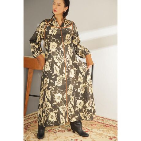 エキゾチックな大柄を甘織りの綿麻素材にのせたプリントワンピース。薄手の筋入り紙に描いた手描きのアートをそのまま素材にプリントした1枚です。前開きで羽織をしても使用でき、襟元はチャイナデザインが施されています。ボリューム感のあるフレアーシルエットですが、カフスが長めになっているのでボリュームを抑えて上品な印象をプラス。ヴィンテージドレスのような雰囲気があるアイテムです。