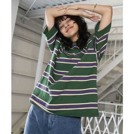 これからの季節に1枚は欲しいボーダーTシャツ。旬のビッグシルエット&ドロップショルダーで1枚で着こなしが決まるアイテムです。袖はやや長めの肘丈にすることでより今年らしいシルエットに仕上がっています。ワイドな身幅ながら着丈は長すぎないボックスシルエットになっておりボトムとのバランスが取りやすいのもポイント。